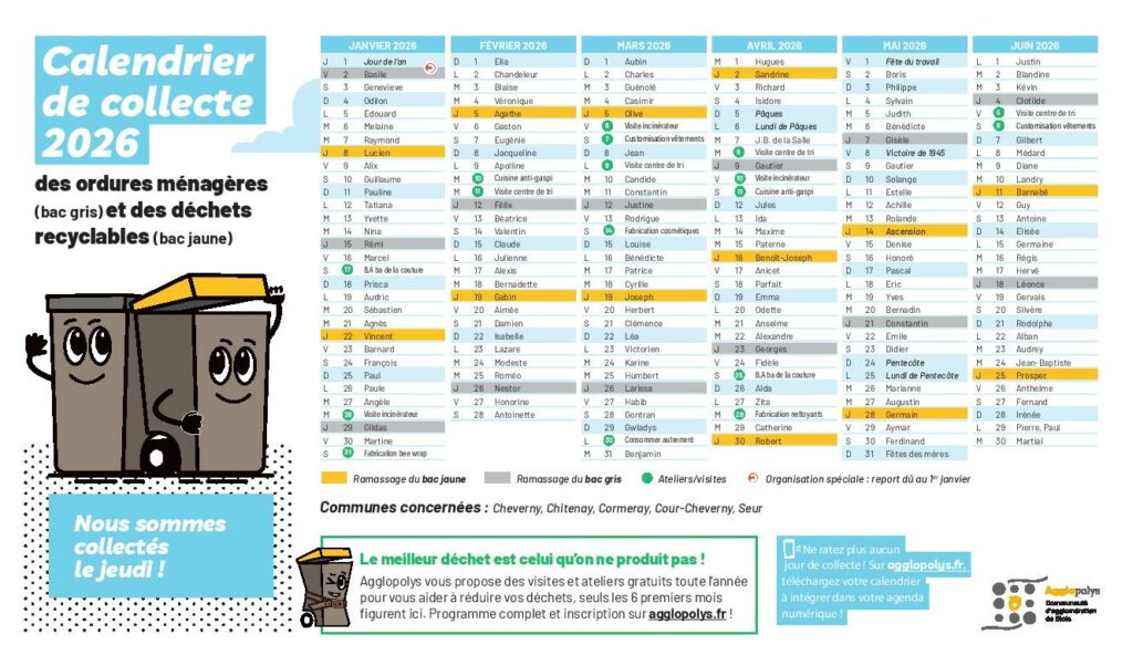 - La collecte a lieu le jeudi matin entre 5 h et 12h30, merci donc de présenter vos bacs la veille au soir.